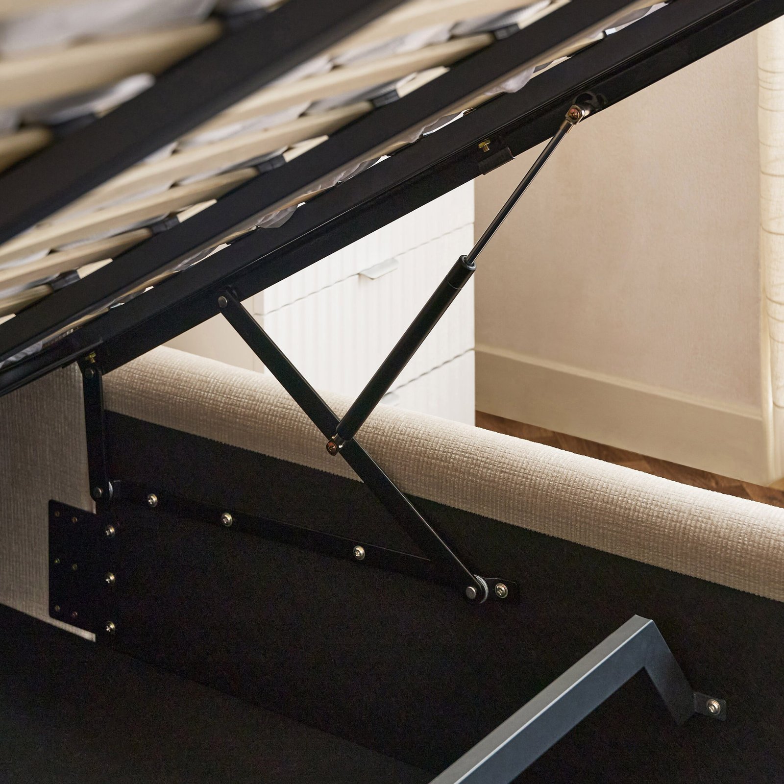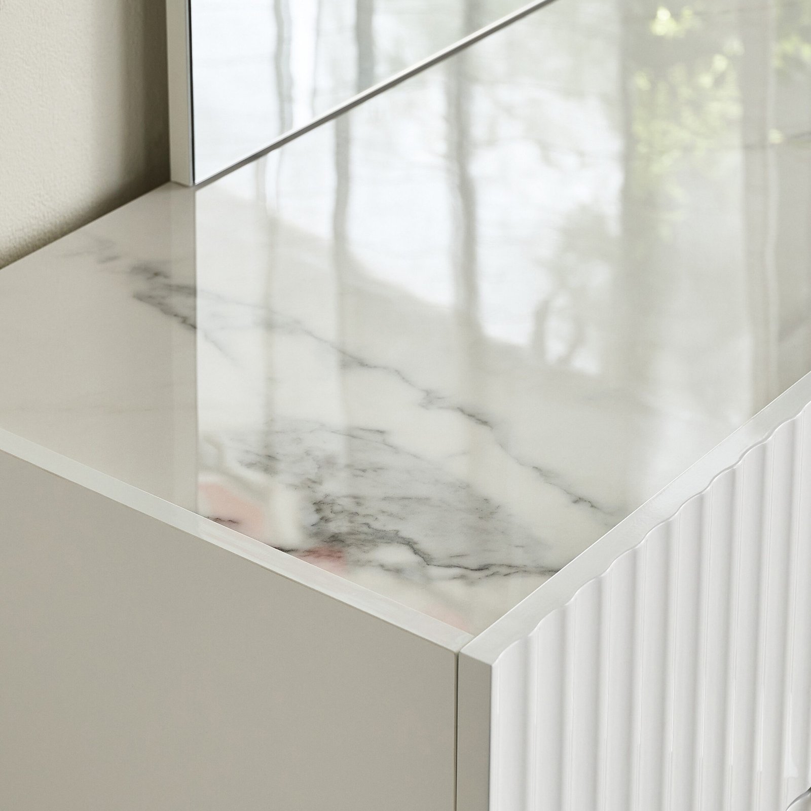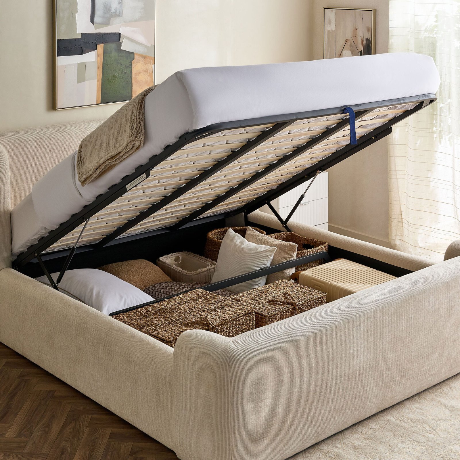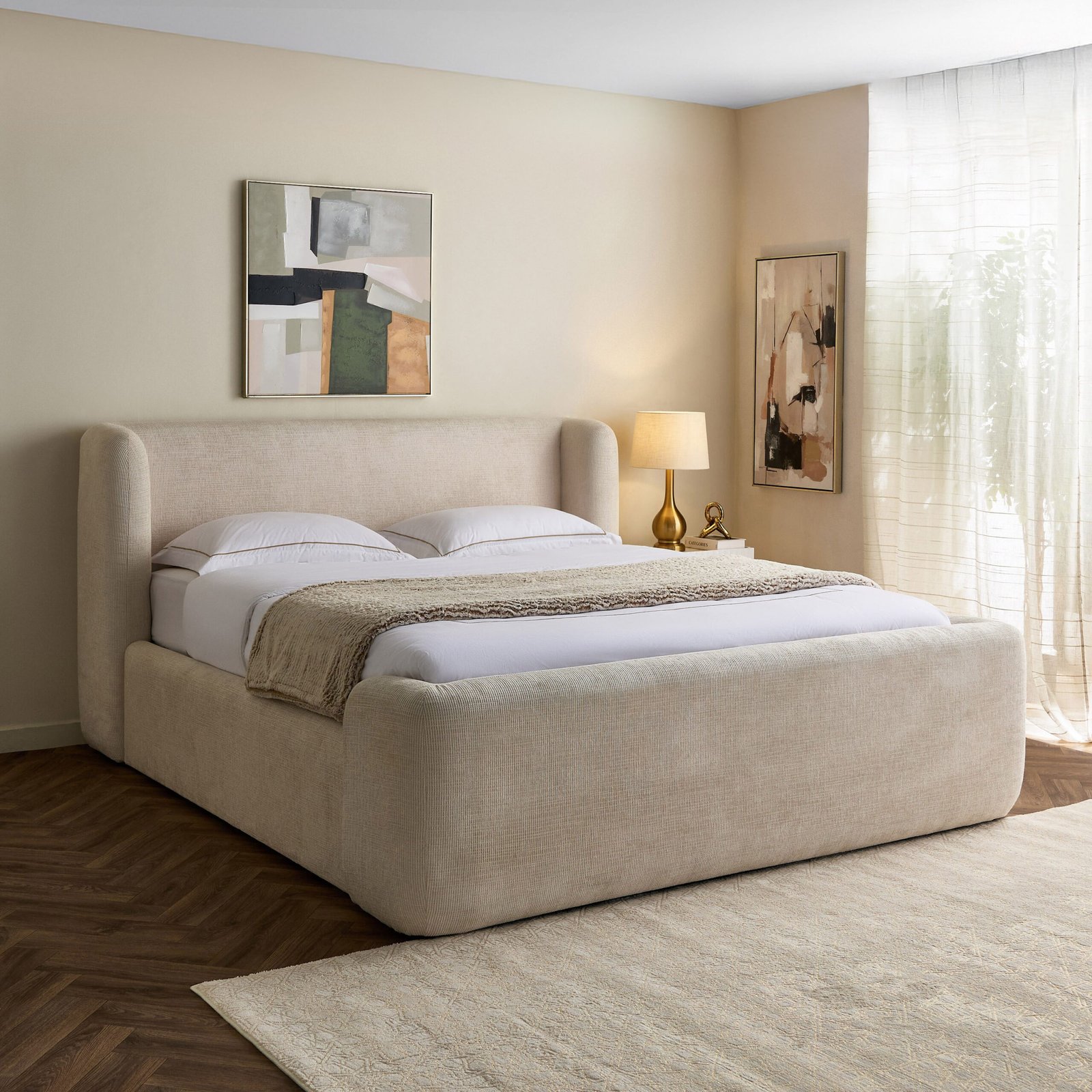The plush neutral upholstery and elegant winged headboard create a stunning focal point, while the hydraulic lift-up storage system helps keep your bedroom neat and clutter-free. Accented with premium sintered stone surfaces, this collection offers durability, easy maintenance, and a refined contemporary look.