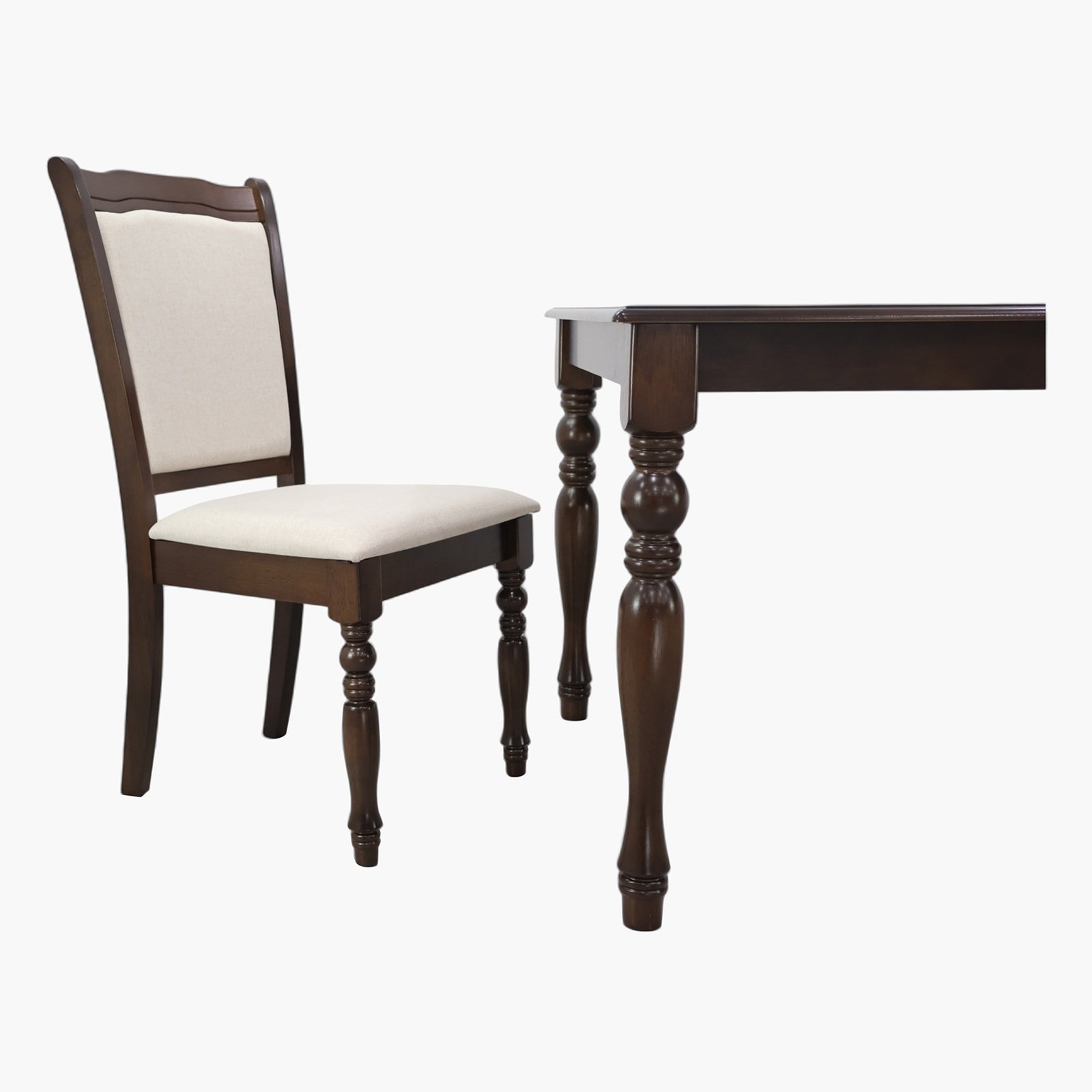 Crafted from solid rubber wood and MDF, the table showcases a refined matte finish that is both scratch and stain resistant, making it ideal for everyday use. The fabric-upholstered chairs with foam-filled seats ensure long-lasting comfort, whether you’re hosting dinner parties or enjoying family meals.