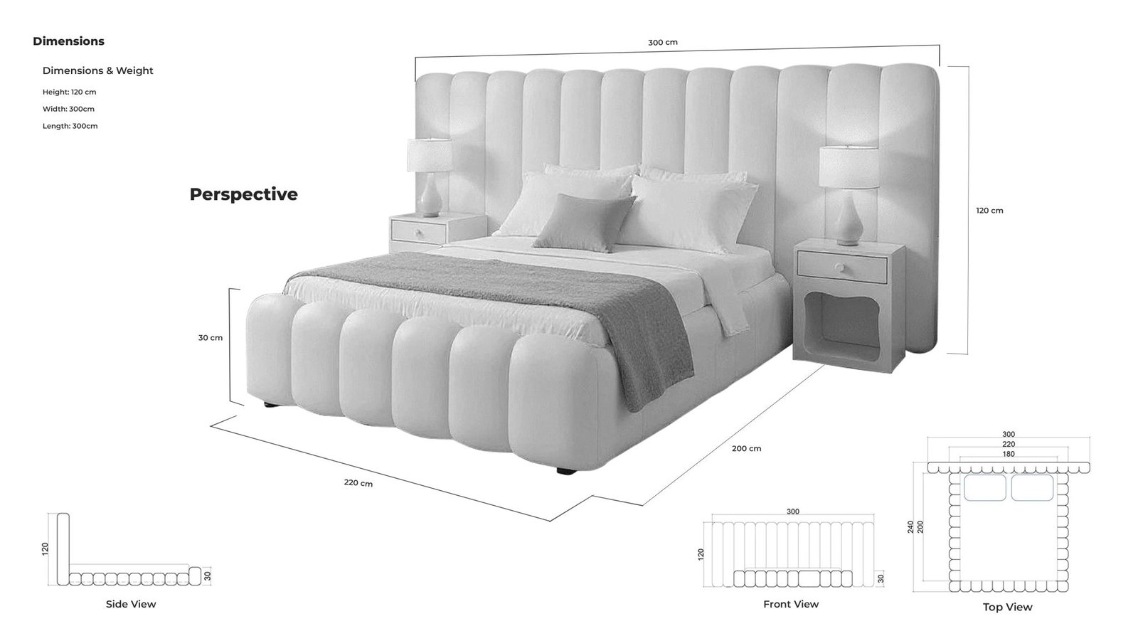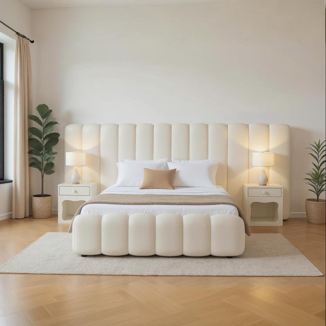 Experience refined comfort and modern elegance with this Luxury Upholstered Bed Frame by Althea Furniture. Designed as a statement piece for contemporary bedrooms, this bed features an extra-tall vertical channel tufted headboard, a fully padded structure, and integrated side tables with storage drawers—combining beauty, comfort, and functionality in one design.
